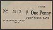 World War II, Internment Camp Hay, Camp Seven Bank ND (c1941) Australian Defence Canteens Eastern Command Camp no 7 1d canteen coupon from book no 010965, on blue/grey card. AH Pettifer, Acting Government Printer. UNC. With envelope typed Hay P.O.W. Camp Specimen Notes. The camp no '7' has been die cut through the paper. Only several sets of these notes are known, all notes have the same serial number & are believed to be Specimens sent to the camps, see letter (Feller pg 107). This note illustrated Australian History 1901-2001 As seen through banknotes by J & E Dauer & J Pettit, pg 223. C-1201, Feller-960 cat US$2000. Very Rare. Ex Dave Allen collection. (P)