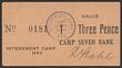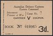 World War II. Internment Camp Hay Camp Seven Bank ND (1941) Australian Defence Canteens Eastern Command Camp no 7 3d canteen coupon book no 010965 on cream card. AH Pettifer, Acting Government Printer. UNC. The camp number '7' has been die cut through the paper. Only several sets of these notes are known. All notes have the same serial number & are believed to be Specimens sent to the camps see letter (Feller pg 107). This note illustrated in Australian History 1901-2001 As seen through banknotes by J & E Dauer & J Pettit, pg 223. Very Rare. Ex Dave Allen collection. C-1203, Feller AU-962 cat US$2000. (P)