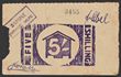 World War II, Internment Camp Hay, Camp 8 ND (1941) 5/- (Nissan Hut design) no 3455 with handstamp Sample Without Value & 2 sigs. Purple on off white (toilet) paper, 114x64mm. Separation flts at right, toning. This note was given to Rabbi Falk by camp internees when he visited in December 1940. Feller AU-946. C-1236, MVR Hay Internment Camp Notes this note is illustrated pg 71. Also illustrated Australian History 1901-2001 As seen through banknotes, pg 217. Extremely Rare with at most several known. Ex Dave Allen collection. (P)