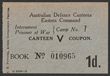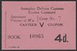 World War II. Internment Camp Hay Camp Seven Bank ND (1941) Australian Defence Canteens Eastern Command Camp no 7 4d canteen coupon book no 10965 on deep pink card. AH Pettifer, Acting Government Printer. UNC. The camp number '7' has been die cut through the paper. Only several sets of these notes are known. All notes have the same serial number & are believed to be Specimens sent to the camps see letter (Feller pg 107). This note illustrated in Australian History 1901-2001 As seen through banknotes by J & E Dauer & J Pettit, pg 223. Very Rare. Ex Dave Allen collection. C-1204, Feller AU-963 cat US$2000. (P)