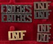 Army.c1914-16 AIF metal shoulder titles for Infantry & Engineers. Inc oxidised INF titles (4) in 2 prs matched by style (c12mm) with 1 marked by Stokes, brass INF title unmarked but English-made & ENGRS oxidised titles (2). All lugs complete. VGC. (7) |