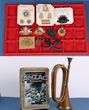 Army. WWI to present hat, collar & non voided shoulder titles (20) inc WWI issue oxidised Rising Sun hat badge & a similar WWII example etc. Federation Rising Sun & Engineer cap badges, only have 1 pin each. Also WWI & WWII RTAS badges. All in a battered ANZAC biscuit tin. With an early brass bugle, unmarked (mouth piece replaced). Mostly G-VGC. (23 inc tin) |