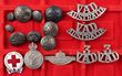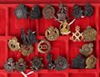 ANZAC biscuit tin with approx 33 modern British & US badges & buttons plus 100 useful brass & iron backing plates for various Metal Trade & Skill at Arm badges & Foreign badge, c1914-2000. Stored in an ANZAC commemorative biscuit tin 2014. There are mainly 5 varying shapes of pre-punched plates with 2, 3, 4, 5 & 6 holes. These are often missing from original badges & are useful when restoring uniforms. The limited edition 2014 commemorative ANZAC biscuit tin has some shallow dings. Mostly G-VGC. (133) |