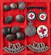 c1930s-50s VAD Voluntary Aid Detachment badges & buttons. Inc VAD Australia Long Service badge in Sterling Silver (no bars), VAD enamel badge, VAD hat badge, 3/VAD titles (2), VAD/AUSTRALIA titles (2) & VAD uniform buttons oxidised (9) cWWII (inc 2 extra small size). All lugs/pins complete. G-VGC. (15) |