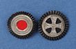 Imperial Prussia. Reserve Officer field cap cockade set of 2. National cockade of pressed, black fibre ground with white metal central disc, red cloth centre (2x prong reverse) 21mm; reserve cockade of pressed, black fibre ground, white metal disc with Reservist Cross & motto to centre. 2x prong reverse 23mm. aEF. (2) |