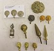 Army. 1900-60s. Lot of 14 metal badges that were used as the hardware on pith helmets & cross belts with Lancashire examples inc a large badge Lancashire & a whistle (Military style). Also inc helmet spikes, ball mount & hooks (Lancashire & generic lion head). (14)