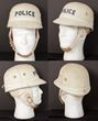 Police ca1960-70 Motorcyclist white protective helmet. White vinyl with rubber ear vents. 'Police' stencilled in blue across front. Crimson silk-like material lining to body & to white vinyl ear & neck flats. 'The Corker' by J Campton, Sons & Webb Ltd. VGC