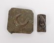 Turkey. ca1876-1914 Ottoman Army Enlisted Ranks belt plate, 1876 pattern. Excavated example. Solid brass square plate 60mm x 60mm bearing angled crescent moon to centre (applied-rivetted). Reverse with belt loop & belt-tip hook. Together with a bayonet scabbard frog stud (tear shaped, on angled brass bracket - possibly for triangular bayonet). Minor disfiguring, patination, gVF. Scarce |