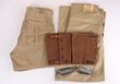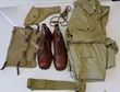Army. WWII khaki clothing/equipment. Inc khaki shirt, 1942 dated shorts. 37 pattern gaiters, holster, belt & pistol lanyard. Comes with a pair of brown, 1942 dated, size 8/4 Army boots. GC. 7 nice WWII items.
