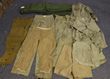Navy. trousers. An unissued pair of khaki cotton bell bottom service trousers. Tropical issue with paper tag, WWII. Also a pair of khaki cotton shirts of unusual construction. Possibly naval. Damage to rear pocket, used condition & pair of brown canvas/leather gaiters. Probably naval & pre 1939 plus RN/RAN metal clasp knives (2), ca WWII or before. Large all metal style. Two variations, nice condition. Khaki RAN bell bottoms are scarce war time item. (5)