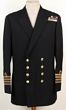 Navy. C1950s Captain's dark blue wool jacket. Double breasted design, complete with all RAN buttons & black cummerbund. Lighter weight wool blend. Made by the government factory M.Tx. Not named. Complete with medal ribbons for WWII service in Africa & the Pacific. No coloured underlay to rank. Small tear top of lining, lining shows fatigue in places. Light wear. Fraying/damage to rear of rank rings on both sleeves. Tunic worn by an Australia WWII veteran in the RAN, with Captain's rank, after WWII.