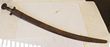 India. Sword c1850s Tulwar sword. Period leather scabbard, characteristic long, curved blade showing light age patina. Knurled handle with 1 piece crossguard & handle leading to round disc pommel. GC. |