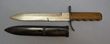 Germany? Bayonet Mauser Model 1935? Fullered blade, 33cm long with rounded tip & sharpened edge, stamped 8-411 to blade, wooden grips. With mismatched, poorly fitting scabbard (too long). Also GB WWII No 4 MKII spike bayonet. C/W black painted, some wear scabbard. Overall GC. (2 items) |