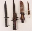 World. Bayonets. Inc Swedish M1896 bayonet (complete with scabbard but shows rust although blade is bright). GC. Belgium M1889 bayonet & scabbard. Shows rust, 2 dings to scabbard. Bayonet does not quite fit all the way in. Comes with an old German style frog (damaged). Poor condition. British P1888 bayonet shortened & shaped to a knife. Locking mechanism removed, rust pitted. Home-made scabbard plus hunting knife for a child. Handle incomplete, no scabbard, shows rust on blade. Poor condition. Poor-Good condition, some may clean up. (4) |