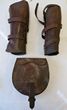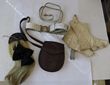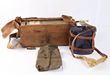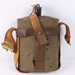 Army. Stohwasser leggings pr, dated 1928 in brown leather. Plus a pr of British Officer's/Gentleman's leather leggings. WWI kidney shaped tin, WWI entrenching tool, handle marked AAOD, tool very rusted, no date, WWI leather rifle sling, pistol lanyard. WWI large haversack/backpack CGHF 1917, torn where rear strap attaches to bag, officially lengthened WWI Webley holster with rod. Pr light khaki fox puttees & 3 1916 Australian leather ammunition pouches. Fair-GC. 12 mainly WWI dated items. |