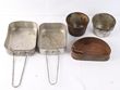Army. WWI Field mess kit. Light Horse folding handle cups, light rust (2). WWI mess tin lid 'D' form marked with crows foot. Some surface rust. WWII Australian mess tins marked DD FEDEPRA Tinware WA. Set of 2, no rust. Fair-GC. |