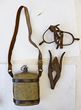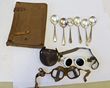 Army. Officer's rubberised canvas map case WWI or WWII, WWII MK1 A.A. goggles, pr of cWWII Japanese dust goggles in case & large spoons (6) with RAAF QC badge. A.A. goggles are scarce. The leather case for the Japanese goggles has been modified. The map case is a private purchase item with pockets for tools, pencils, note pad & maps. Has 1 tool inside & message forms (7). No sling present. Celluloid window damaged. Could be WWI or 1930s. 1 press stud pulled. Noticed small tear to canvas cover. (9) |