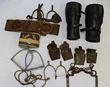 Army. c1939-45 carton lot of webbing, tools & kit bag locks. Inc reproduction pattern 15 (2), leather helve holders, kit back locks (4), folding wire cutters (2), WWII Australian Greg Steel fixed handle wire cutter, long handled/folding wire cutters (damaged) & cWWII basic pouch with an old wooden battery inside. One of the folding wire cutters has been repaired & is WWI dated. (14) |