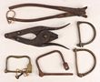 Army. c1939-45 wire cutters (2 diff) & kit bag locks (4). 1 folding type wire cutter dated 1943 & made by Sunshine. Other wire cutter is by Greg Steel & is fixed handle D?D marked, no date. Usual, crude cast design. The kit bag locks are slightly different. One has a built-in lock & key. Unusual. (6) |