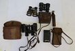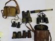 Army. Binoculars, 5 pairs, 2 cases & a small draw telescope. 1 pair binoculars ca WWI. 4 other pairs are centre focus, various sizes & conditions. Draw telescope in uncleaned condition. Fair-average. War Department marks on 1st binoculars, nice telescope. (6 + 2 covers) |