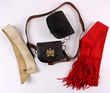 Army. Aust/GB firearms. Black cartridge pouch with KC gilded general service badge fitted. Heavily congealed. With brown pouch belt strap (which is a pair of brown sword slings attached to each other). Large black pouch for cartridges. Marked WD Hobson Sons C & M 1885 London. Latch strap unstitched from front flap but still present. Doe skin shoulder strap in white. Colour Sergeant sash in scarlet. Fair-GC. Some TLC required but a rare, early pouch. (4) |