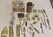 Army. c1939-45 wire cutters (2 diff) & brass kit bag locks (4). 1 wire cutter is folding type made by Sunshine in 1943, with rope lanyard. Other wire cutter is fixed handle type made by Greg Steel. Usual crude, cast design. D?D marked, no date. The kit bag locks (4) are mostly slightly diff shapes. (6) |