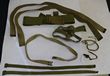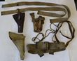 Army. Jodhpurs, WWII era khaki. 1953 dated webbing gaiters pr, rifle slings (4 diff), khaki short puttees, helmet net cover, brass pistol cleaning rod, 1941 dated leather pistol holster, 2 diff leather bayonet frogs, 1943 dated belt & buckle, water bottle carrier, bottle & cover, no strap. Overall GC. Some good WWII display items. (14 items) |