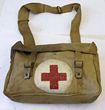 Army. cWWII Red Cross marked haversack with contents. Web haversack with integral sling, Red Cross stencilled to front. Maker's name/date unreadable. Broad arrows are discernable. Bag contains shell dressings (3), wadding, iodine ampoules, bandages (3), cotton wool, talcum powder & what seems to be an arm sling. Contents are WWII dated when marked. Bag has oil, water stains & some fade. No damage apparent. |