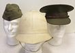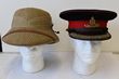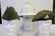 Army, peaked cap other ranks, wool, dated 1942. KC map buttons, leather edged brim, this scuffed, sweatband partially detached. WWII sidecaps khaki (2) dated 1940 & 43, heavy moth holes to both, 1 no buttons. Pith helmet by Belton Melbourne, some cork collapsed. Fair condition. 4 WWII hats. |