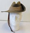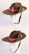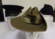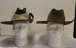 Army. Slouch hats with puggarees (2). One early WWII made & the other is post WWII. Both hats missing their liners & show wear. The pre, or early, war hat has brown rim, sewn clip to fold the brim is missing (never had press stud), brown air vents & clear signs where the chin strap hooks were sewn in (now missing). This hat has no insignia although it did once. Edge binding has frayed all the way around. A true service worn hat. The post war hat has a puggaree & once had insignia. There is a hole at the base of the hat. This is hardly noticeable when the brim is folded back. Two service used hats, one being ca WWII. |
