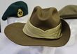 Army, Slouch hat, WWII 1942 dated, size 7½ with puggaree, in unissued condition. Push stud to rim fastener, brown vent eyelets, no chin strap. Plus 1952 green beret with badge of Royal Australian Infantry Corps in gilded brass & post WWII khaki beret by Beret Mnfrs. GC. Nice WWII unissued slouch hat. (3) |