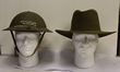 Army. Slouch hats. Unissued WWII (2). One early war style & the other wartime austerity pattern. The early pattern hat has the edge binding & and the brim fastener & chin strap hooks sewn in. Dated 1942, size 7½. Liner is partly loose, brown eyelets, no puggaree. The austerity pattern has raw edge, press stud & riveted hooks. Large size. Liner is missing, brown eyelets for ventilation. All attributes indicate a wartime made hat. Unissued, minor moth nibbles on 1942 hat. These hats are becoming scarce. Particularly pre-austerity pattern ones. (2) |