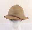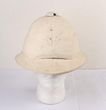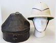 Army. Colonial pattern Aust/GB pith helmet, white & similar in khaki with 4 fold puggaree, of late construction. White helmet chin strap, torn. Both labelled Waterproof tropical helmet, made in England. Comes with a blue over red Artillery pattern pillbox cap, with patent leather chin strap, lined in red satin. GC. (3) |
