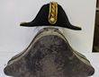 Navy. Aust/GB, bicorn, post 1901 Captain or Commander's bicorn beaver hat. Gilt KC rope edged Royal Navy button & twisted bullion lace in really nice condition. Made by Larcom & Veysey Ltd, Portsmouth. Comes in heavily aged blackened bicorn tin. G-VGC. A very pleasing Navy bicorn. |