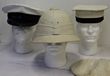 Navy, peaked cap, white vinyl with chin strap. Rating cap with vinyl top. Wolseley pattern fibreglass helmet & a cloth navy cap cover. GC. (4) |