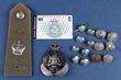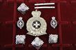 Queensland Police QC hat badge, rank pips & stars (6) plus Tasmanian Police Diligent & Ethical Service Medal & miniature (QC). Medals copies? Enamel QC Queensland Police badge has had lugs removed & pin fitted, the hook to rear is missing. (9)