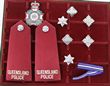 Queensland Police hat badge, enamelled, numbered, by Parkes, pair of maroon shoulder boards, metal rank devices & a Police medal ribbon. One of the rank badges is missing a lug, otherwise all lugs/fittings are present. No damage to the coloured finish on the hat badge. (10)