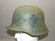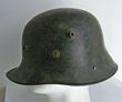 Austria. 1916-18 M16 steel helmet. Based on the German design. This example retains the green painted finish. 3 pad liner with one pad detached from liner. Leather chin strap with broken end. A hard to find example. gVF |