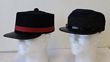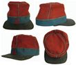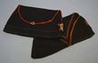 Unknown kepi style forage cap with bank of black oak leaf lace around cap, of woollen construction with leather peak. 2 black cloth covered buttons to hold chin strap. Leather black chin strap, leather sweatband & 2 sweat holes to each side, lined in dark brown satin. Plus unknown kepi style forage cap, black wool with button & figure to top, 3/4 inch era faded band to bottom, no sweatband, black cloth lining. Remains of sweatband are late faux leather. Overall GC. (2) |