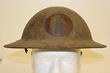 USA. Army. Helmet. WWI British pattern 1917 Brodie helmet with typical bails of the type used in Britain in WWI. Donut is present but wool liner badly deteriorated/damaged. Has rim protector. Could be salvaged battlefield helmet reissued to US troops, chin strap missing. Has insignia to front of Black Artillery shell on red circular disc shaped background. In 1917 when US troops finally arrived in Europe. 400,000 had to be issued British helmets. Fair condition. Unusual combination US insignia on British helmet. |