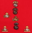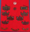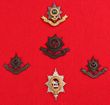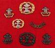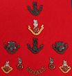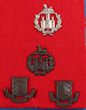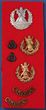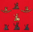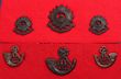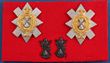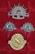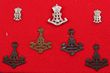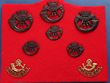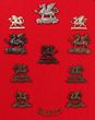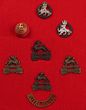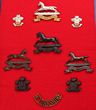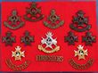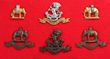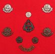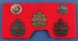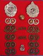 Army. Display card with approx 50 items of insignia. Of note Victorian Officer's 4-piece Glengarry badge of the King's Regiment Liverpool, 2 fixing pins to the rear, mothing to red velvet backing (RARE). RF/City of London is missing its original grenade & this grenade has no lugs & is unattached. Tank Corps hat & collars, Yorks & Lanc collars & 10 Ceylon Light Infantry buttons. GC. (Approx 50)