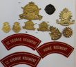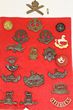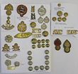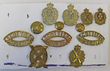 Army. 1948-60. 16th Infantry Battalion Cameron Highlanders of WA hat badge & (3) QC collars, Perth University Regt cap, (2) collars (QC hat & KC collars) & Melbourne University cap & (2) collars, also a mix of KC & QC metal insignia. All lugs complete. Plus (9) cloth shoulder titles, bordered. The 16th Battalion hat badge is a copy. Perth Uni hat badge has a repaired lug. Ref Cossum pgs 22, 10, 27. (21 items)