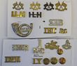 Army. c1899 Boer War hat & collar badges. QVC where appropriate. Inc multi-piece 42nd Regt hat badge QVC, Sergeants pattern pre 1901. South Staffordshire hat QVC, large strung bugle c55mm & various collar badges mostly in prs (some are Officer versions). All lugs appear present (the Black Watch collars have lugs partly closed but will still take a pin). (20 items)