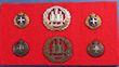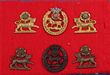 Army. Border Regiment selection of Officer's badges. Inc KC post 1902 service dress cap badge on blades & collar badge pr on lugs (no 1899-1902 Battle Honour). With 2 different collar badges, the dragon in wreath China one having minor enamel loss at top. G-VGC. (5)