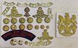 1897 QV NZ Regular Forces helmet plate, NZFA brass titles, KC NZ Artillery, RNZA title, Artillery buttons & cloth titles . The NZA title has one lug missing o/w GC. (30)