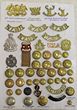 Display card with Army badges 1890s & a button. Inc button for NZ Canterbury Scottish, NZ Signal Corp (Stokes Melbourne made), NZR brass titles, NZ Cyclist Corp collar, NZ Engineers, various QC fire gilt Officer's badges plus a sweetheart badge (7th WWCR) plus an 'Onward' hand engraved trench art badge (no lugs/fittings to rear). One ASC badge has one lug. Otherwise all lugs appear complete. Nice lot. (38 items)