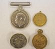 1914-24 British War Medal, no ribbon, to '22037 SPR G M CROUCH 14 FCE AIF', George Maurice Crouch from Auburn. Enl 8/9/17 RTA 22/9/19. Volunteered for Active Service - Medically Unfit badge, Returned from Active Service Badge & gold (?) Cricket fob. RAS badge has its number obliterated when a screw post was added for wearing. It is well polished. The Cricket fob is for 1923-24 from APCC & is named to him. (4)
