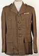 RAF. Squadron Leader's khaki wool service dress jacket, padded half wing for Signaller. With brass KC buttons, removeable for cleaning. Khaki wool summer tunic comp with cloth belt. Tailor label with 'R.E. City Ltd' London. Named to S/Ldr G.W. Dewson. 1961. Ribbon bar shows WWII service, particularly Africa. Includes bravery award for DFC. Fresh look with no damage/mothing. Small stain line to front. May clean off. Scarce named RAF tunic to a decorated combat veteran who saw WWII service. Very researchable. |