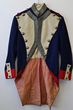 France. Pre 1900 blue, red & white wool coatee, possibly Artillery or a Grenadier of Infantry. Front closes with hooks & eyes, elaborate braid of gold & blue added later to front & collar, possibly by costume company or theatre. Buttons are crossed sword, English-made plain dome. 4 white worsted Grenades to rear skirt. Coatee has white cotton upper lining & pink or faded red cotton lower lining. We have been unable to establish if this is genuine or an old replica. Minor mothing but good for age. This could be stunning if verified original. |