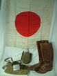 Japan. Army. 1939-45 Imperial Army Officer uniform & equipment lot, near comp. Model 1930 Officer's field tunic comp with bullion on red shoulder rank boards to Captain, red gorget patches & white under collar; near matched pr of breeches (field repairs); pr of brown leather Officer's long boots; Officer's double-prong brown leather waist belt; Army haversack in canvas with tape ties dated 'Showa Yr 18' (=1943); Officer's Taisho era cloth covered aluminium water bottle with screw cup/lid that has provision for a small compass (this damaged) with leather strap; aluminium cigarette case with embossed design of a field artillery gun & crew; uninscribed, original Hokobokuro (personal battle flag) of sun disc printed on silk with leather tab hoist reinforcing. Minor moth to tunic & trousers, the latter with field repairs. Overall VGC. A scarce Army Officer uniform, mainly of the Taisho era but also utilised in China & WWII. Retail if bought individually $2000-$2500. |